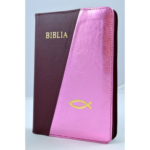 Biblie din piele, marime mijlocie, visiniu / roz, fermoar, cuv. lui Isus cu rosu [053]
