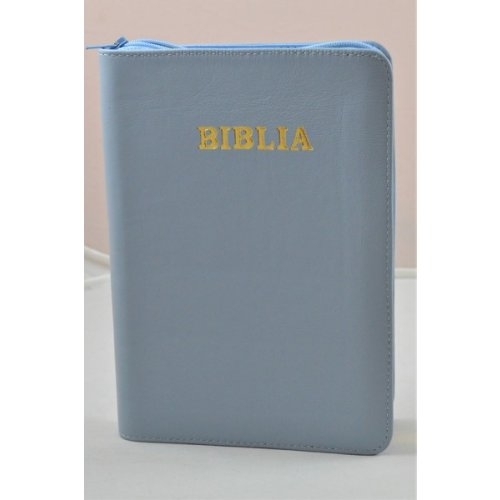 Biblie de lux, medie, din piele, albastru deschis, index, aurita, fermoar [SI 057 PFI]