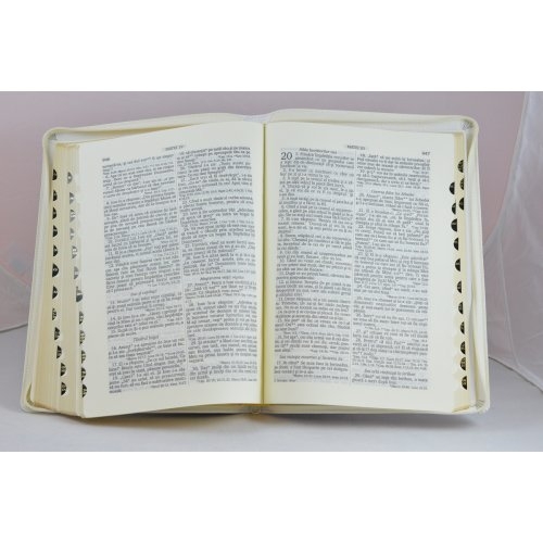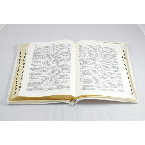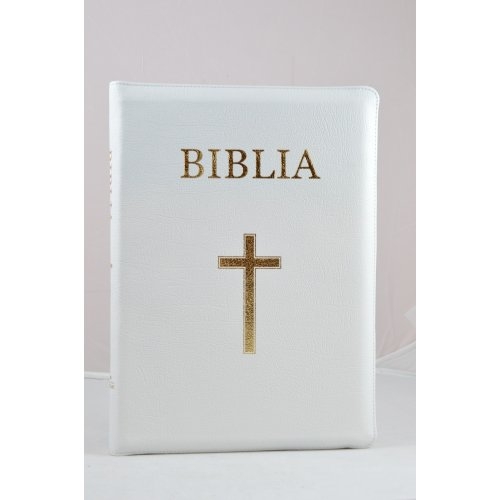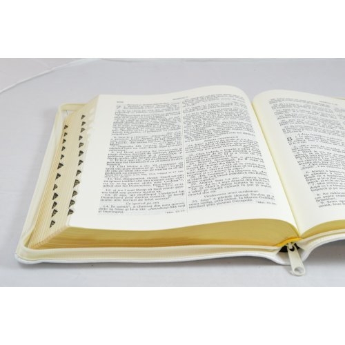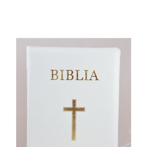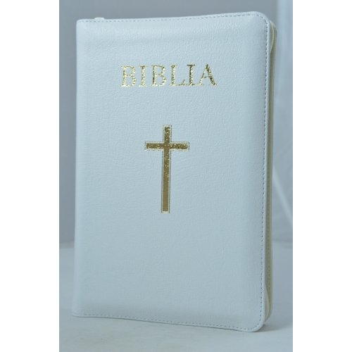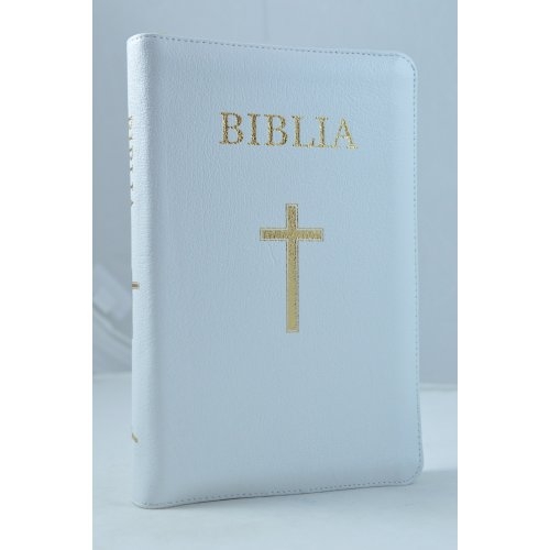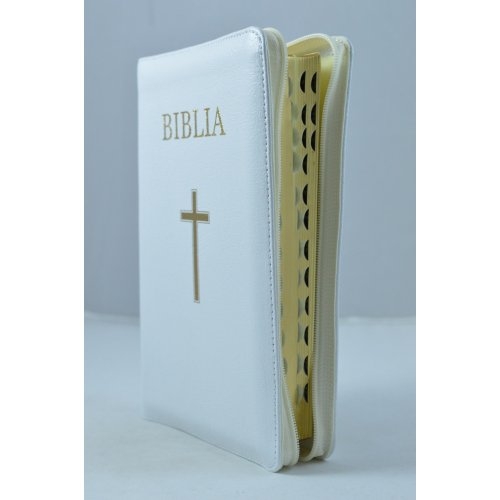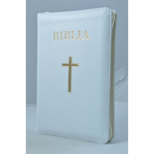 Biblie din piele alba, medie, cu fermoar, index, margini aurii, cu cruce [063 PFI]