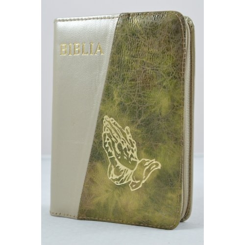 Biblie din piele, dimensiune, bej inchis sidefat/ army fermoar, simbol maini in ruga, cuv. lui Isus in rosu [043 A]