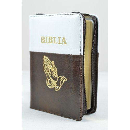 Biblie din piele, dimensiune mica, alb cu maro inchis, fermoar, simbol maini in rugaciune, cuv. lui Isus in rosu [043 A]