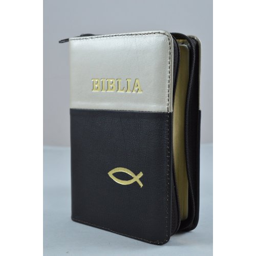 Biblie din piele, dimensiune mica, alb cu negru, fermoar, simbol peste, cuv. lui Isus in rosu [043 A]