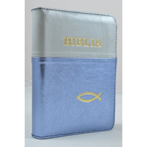 Biblie din piele, dimensiune, albastru metalizat cu gri , fermoar, simbol peste, cuv. lui Isus in rosu [043 A]