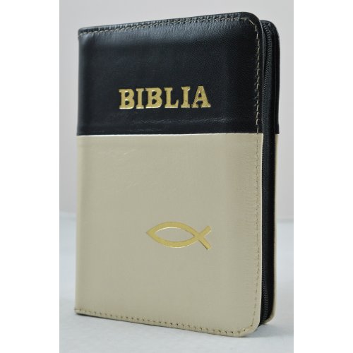 Biblie din piele, dimensiune mica,bej cu negru, fermoar, simbol peste, cuv. lui Isus in rosu [043 A]