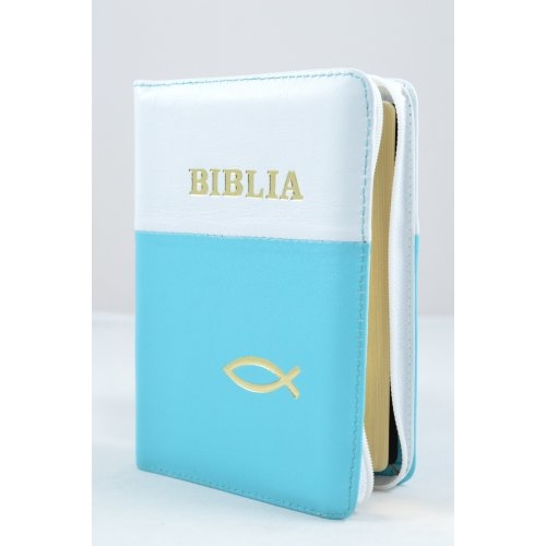 Biblie din piele, dimensiune mica, bleu cu alb, fermoar, simbol peste, cuv. lui Isus in rosu [043 A]