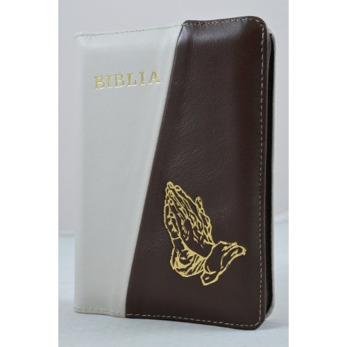 Biblie din piele, dimensiune, crem/maro , fermoar, simbol maini in ruga, cuv. lui Isus in rosu [043 A]