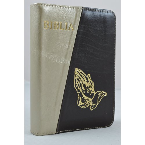 Biblie din piele, dimensiune mica, crem sidefat/maro inchis, fermoar, simbol maini in ruga, cuv. lui Isus in rosu [043 A]