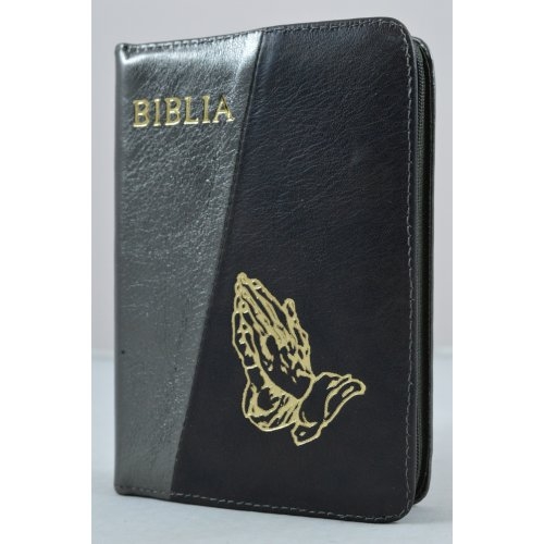 Biblie din piele, dimensiune mica, gri inchis/negru, fermoar, simbol maini in ruga, cuv. lui Isus in rosu [043 A]