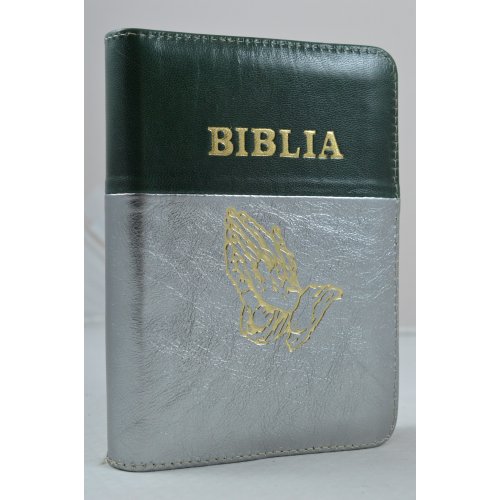 Biblie din piele, dimensiune, gri metalizat cu verde inchis, fermoar, simbol maini in ruga, cuv. lui Isus in rosu [043 A]