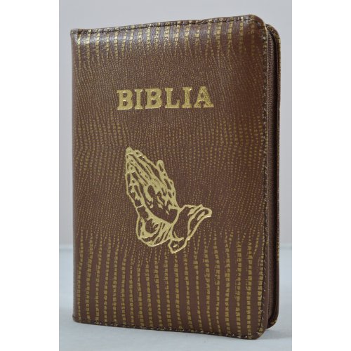 Biblie din piele, dimensiune, maro auriu , fermoar, simbol maini in ruga, cuv. lui Isus in rosu [043 A]