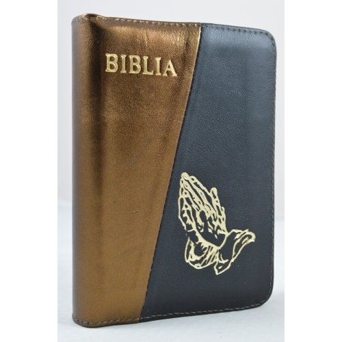 Biblie din piele, dimensiune mica, maro bronz cu negru, fermoar, simbol maini in ruga, cuv. lui Isus in rosu [043 A]