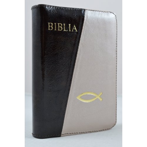 Biblie din piele, dimensiune, maro inchis lacuit/crem sidefat , fermoar, simbol peste, cuv. lui Isus in rosu [043 A]