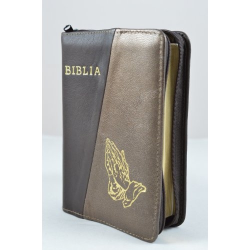 Biblie din piele, dimensiune mica, maroniu inchis cu maroniu deschis, fermoar, simbol maini in rugaciune, cuv. lui Isus in rosu [043 A]