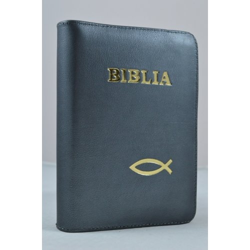 Biblie din piele, dimensiune mica, neagra, fermoar, simbol peste, cuv. lui Isus in rosu [043 A]
