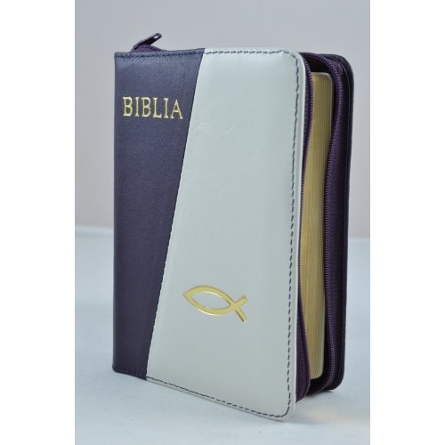 Biblie din piele, dimensiune mica, negru cu alb, fermoar, simbol peste, cuv. lui Isus in rosu [043 A]