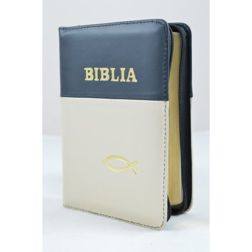 Biblie din piele, dimensiune mica, negru cu alb crem, fermoar, simbol peste, cuv. lui Isus in rosu [043 A]