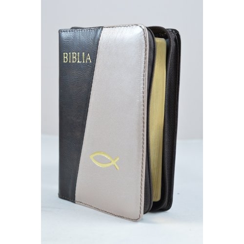 Biblie din piele, dimensiune mica, negru cu alb sidefat, fermoar, simbol peste, cuv. lui Isus in rosu [043 A]