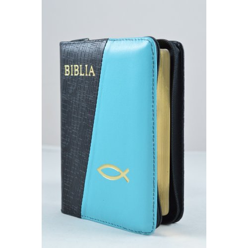 Biblie din piele, dimensiune mica, negru cu bleu , fermoar, simbol peste, cuv. lui Isus in rosu [043 A]