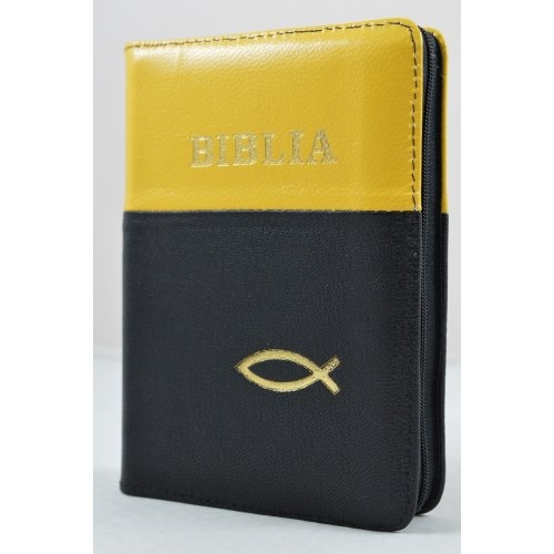 Biblie din piele, dimensiune mica, negru cu galben, fermoar, simbol peste, cuv. lui Isus in rosu [043 A]