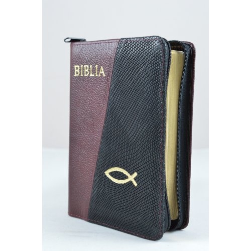 Biblie din piele, dimensiune mica, visinie cu negru model cu striatii, fermoar, simbol peste, cuv. lui Isus in rosu [043 A]
