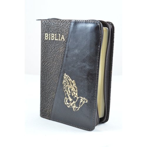 Biblie din piele, dimensiune mica, negru cu model, fermoar, simbol maini in rugaciune cuv. lui Isus in rosu [043 A]