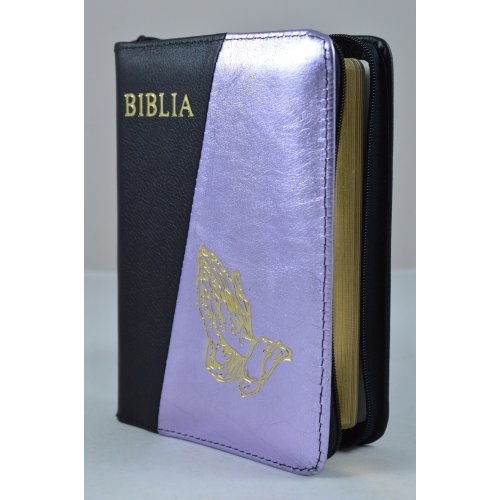 Biblie din piele, dimensiune mica, negru cu mov sidefat, fermoar, simbol maini in rugaciune cuv. lui Isus in rosu [043 A]