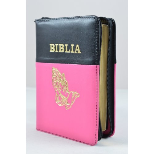 Biblie din piele, dimensiune mica, negru cu roz bombon, fermoar, simbol maini in rugaciune, cuv. lui Isus in rosu [043 A]