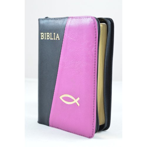 Biblie din piele, dimensiune mica, negru cu roz fucsia, fermoar, simbol peste, cuv. lui Isus in rosu [043 A]