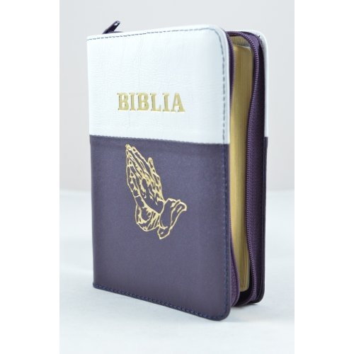 Biblie din piele, dimensiune mica, mov inchis cu alb, fermoar, simbol maini in rugaciune cuv. lui Isus in rosu [043 A]