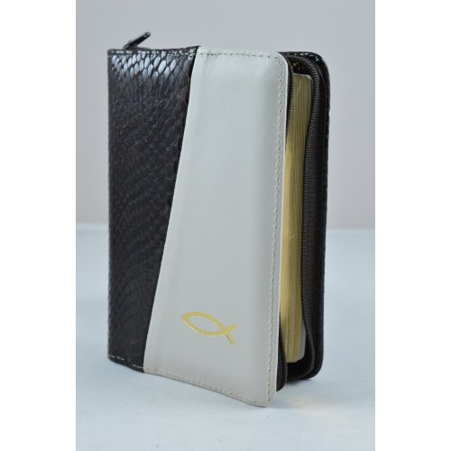 Biblie din piele, dimensiune mica, maro inchis lucios cu alb crem, fermoar, simbol peste, cuv. lui Isus in rosu [043 A]