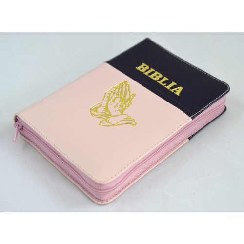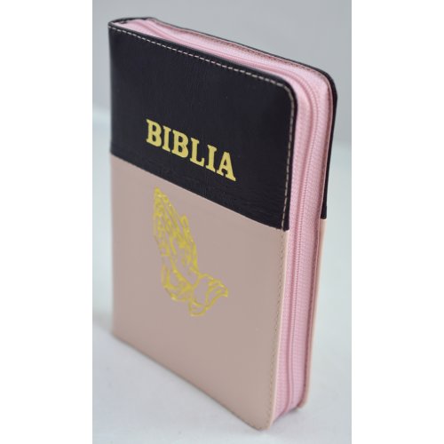 Biblie din piele, dimensiune mica, negru-roz pal, fermoar, cu maini, cuv. lui Isus in rosu [043 A]
