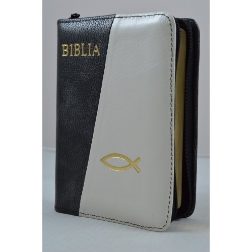 Biblie din piele, dimensiune mica,nuanta de gri texturat/bej, fermoar, simbol peste, cuv. lui Isus in rosu [043 A]