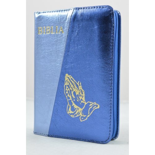 Biblie din piele, dimensiune mica, nuante albastru metalizat, fermoar, simbol maini in ruga, cuv. lui Isus in rosu [043 A]