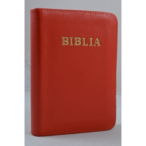 Biblie din piele, dimensiune mica, rosu coral, fermoar, simbol simpla, cuv. lui Isus in rosu [043 A]