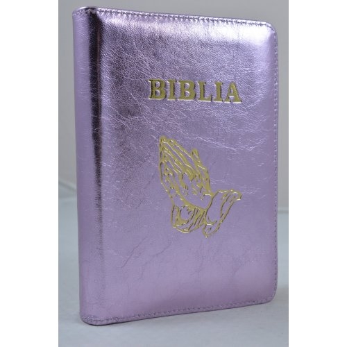 Biblie din piele, dimensiune, roz deschis sidefat, fermoar, margini albe simbol maini in ruga, cuv. lui Isus in rosu [043 PF]