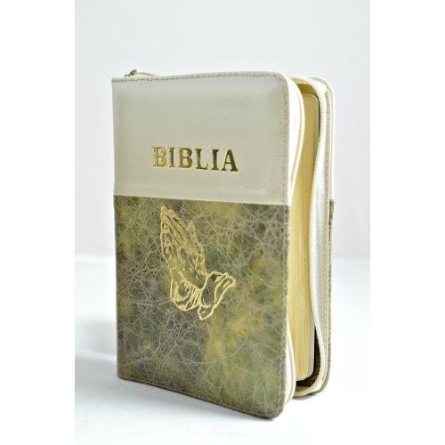 Biblie din piele, dimensiune mica, verde cu modelsi alb sidefat, fermoar, simbol maini in rugaciune cuv. lui Isus in rosu [043 A]