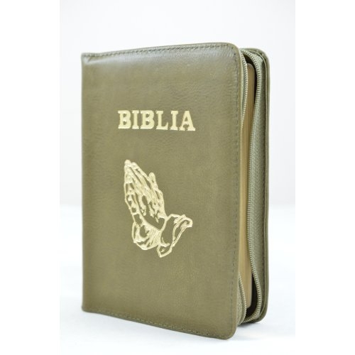 Biblie din piele, dimensiune mica,verde kaki, fermoar, simbol maini in rugaciune cuv. lui Isus in rosu [043 A]