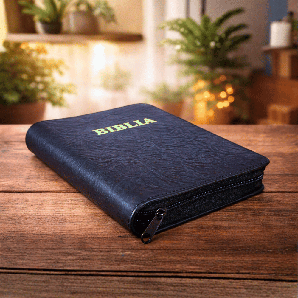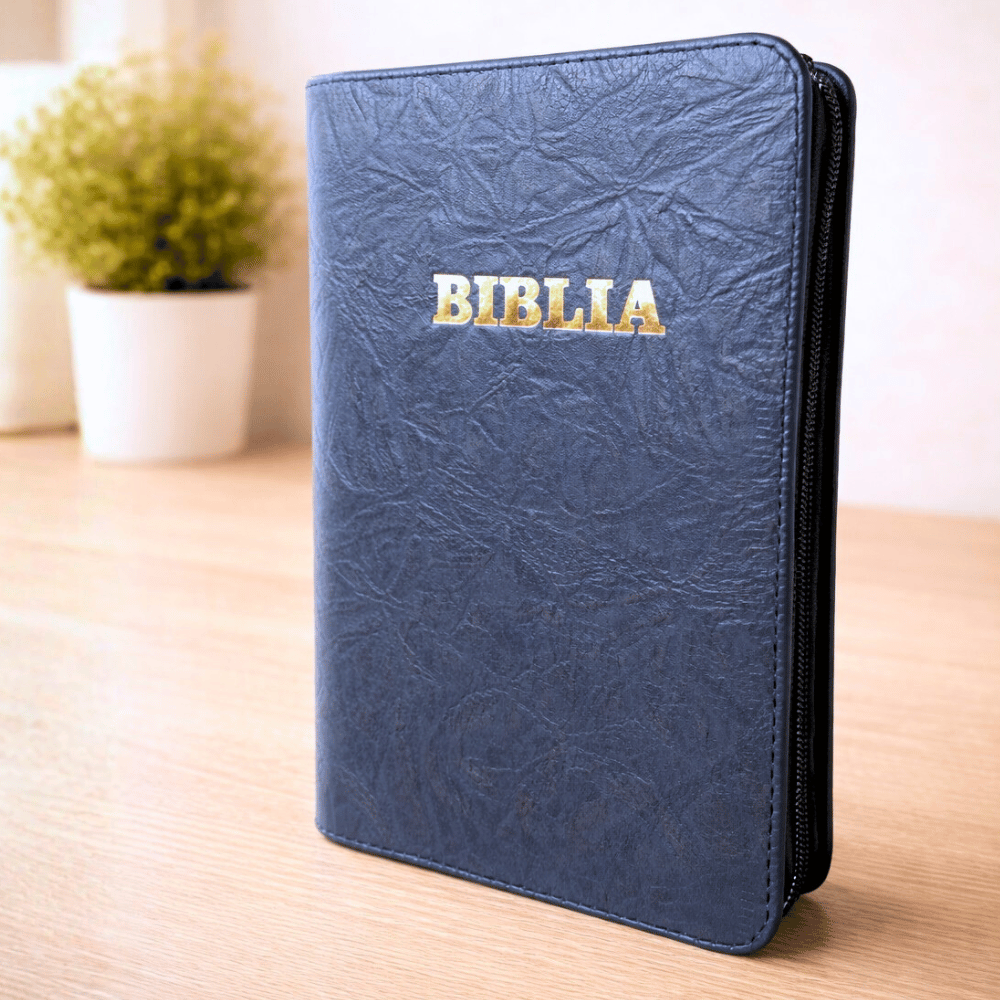 Biblie din piele finisaj rustic, marime medie, bleumarin, fermoar, index, margini aurii, cuv. lui Isus cu rosu [057 PFI]