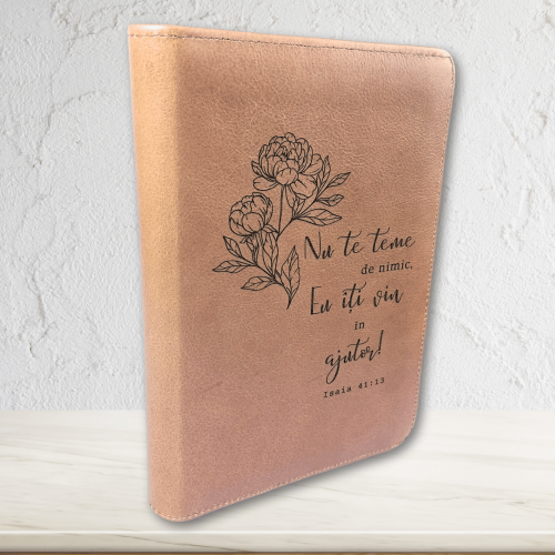 Descoperiți Biblia din piele, un exemplar deosebit ce combină frumusețea și durabilitatea cu o prezentare atent elaborată. Cu dimensiuni compacte de 19 x 13 cm și o grosime de 3.5 cm, această Biblie este perfectă pentru a fi purtată oriunde. Biblia gravată impresionează prin finisajele de calitate, având textul și imaginile de pe copertă sculptate cu finețe în piele naturală.