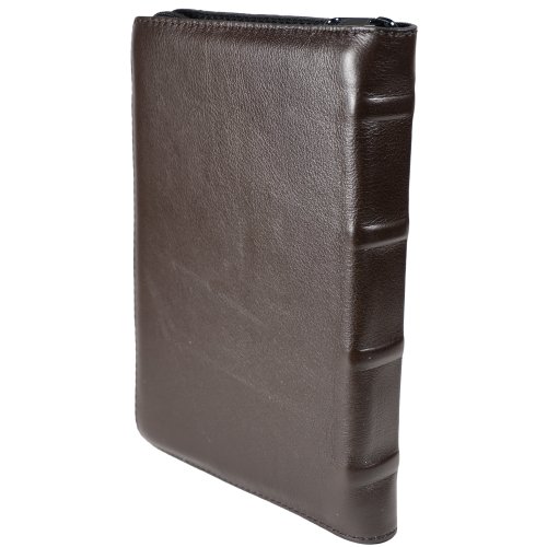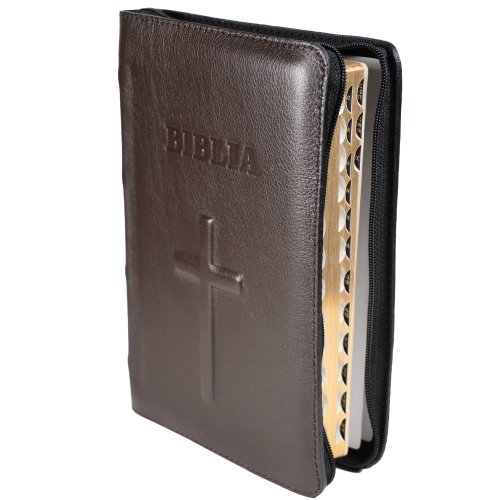 Biblie din piele handmade, marime medie, maro închis, simbol cruce, fermoar, index, margini aurii, cuv. lui Isus cu rosu [057]