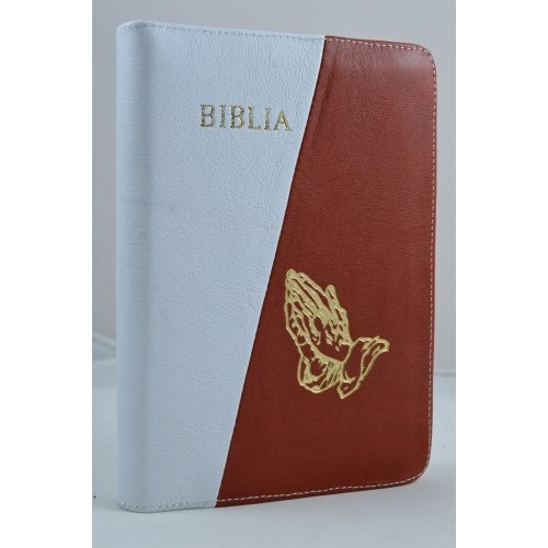 Biblie din piele, marime medie,alb-rosu cu maini, fermoar, index, margini aurii, cuv. lui Isus cu rosu [SB 057 PFI]