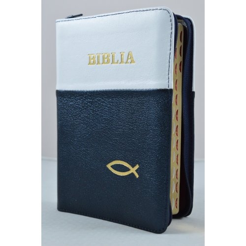 Biblie din piele, marime medie, albastru verzui inchis cu alb, simbol peste, fermoar, index, margini aurii, cuv. lui Isus cu rosu [SB 057 PFI]
