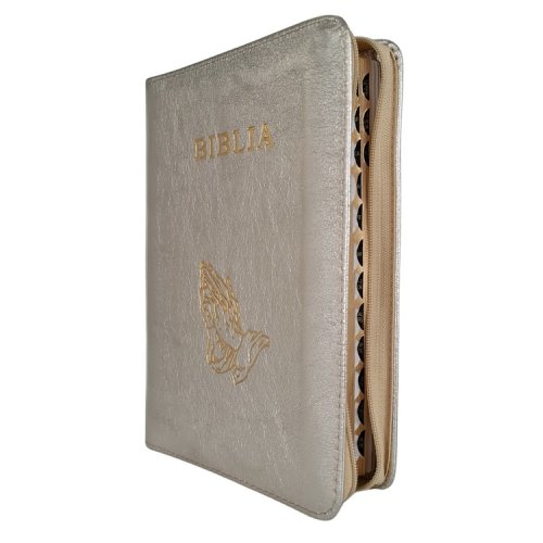 Biblie din piele, marime medie, auriu, simbol maini in rugaciune, fermoar, index, margini aurii, cuv. lui Isus cu rosu [SB 057 PFI]