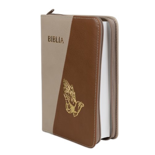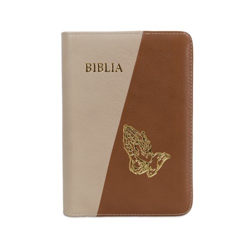 Biblie din piele, marime medie, bej cu maro, fermoar, margini albe, simbol maini in rugaciune, cuv. lui Isus cu rosu [053]