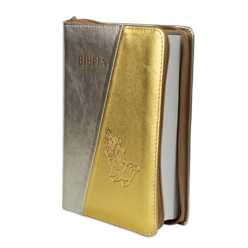 Biblie din piele, marime medie, bej deschis sidefat cu auriu sidefat, fermoar, margini albe, simbol maini in rugaciune, cuv. lui Isus cu rosu [053]