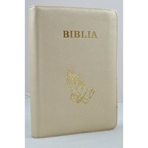 Biblie din piele, marime medie, bej deschis, simbol maini in rugaciune, fermoar, index, margini aurii, cuv. lui Isus cu rosu [SB 057 PFI]
