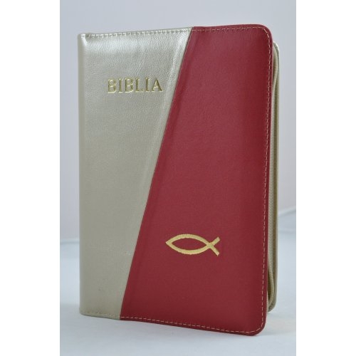 Biblie din piele, marime medie,bej-rosu cu peste, fermoar, index, margini aurii, cuv. lui Isus cu rosu [SB 057 PFI]