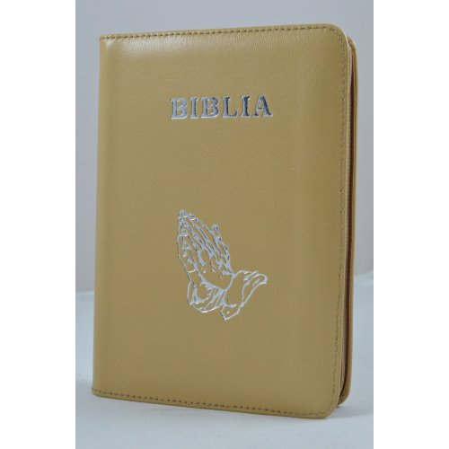 Biblie din piele, marime medie, bej, simbol maini in rugaciune, fermoar, index, margini aurii, cuv. lui Isus cu rosu [SB 057 PFI]