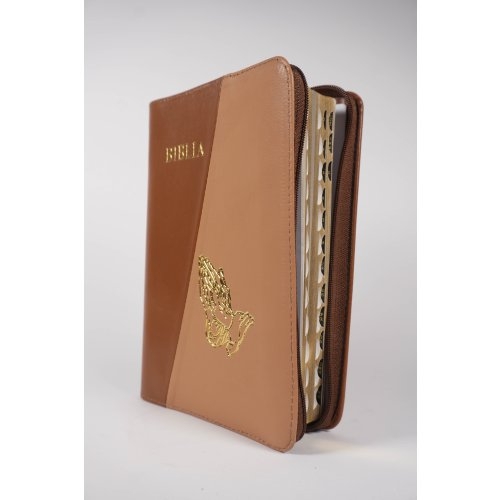 Biblie din piele, marime medie, maro închis cu maro deschis, simbol maini in rugaciune, fermoar, index, margini aurii, cuv. lui Isus cu rosu [SB 057 PFI]