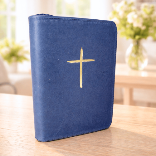 Biblie din piele, marime medie, bleumarin închis, simbol cruce, fermoar, index, margini aurii, cuv. lui Isus cu rosu [057 PFI]
